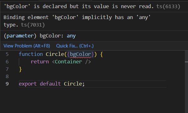 Circle.tsx에서 props인 bgColor를 Typescript가 이해하지 못하고 있습니다. 따라서 interface를 해주겠습니다.