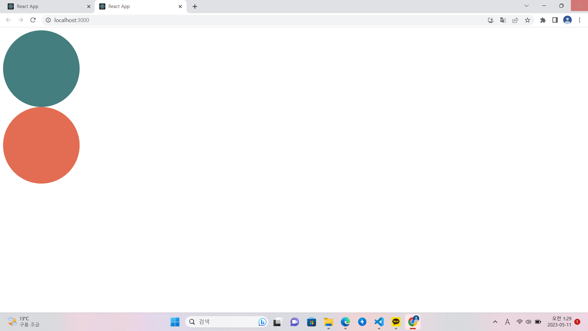 브라우저에 배경색상이 다른 두개의 원모양을 출력해보는 예제를 해보겠습니다.