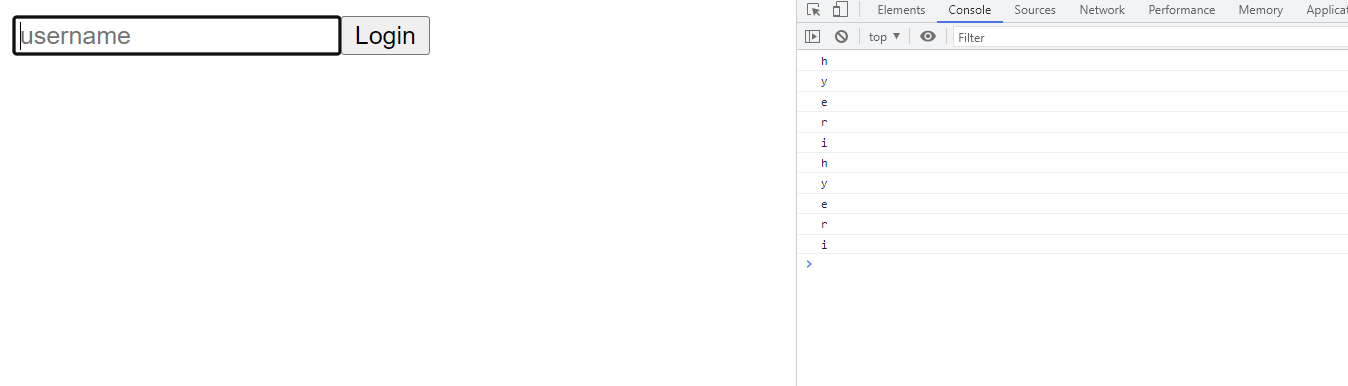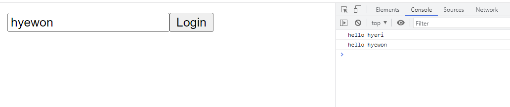 #form에 onSubmit 함수를 연결시켜줬고 로그인 버튼을 누르면 console에서 hello + 입력값을 확인할 수 있습니다.